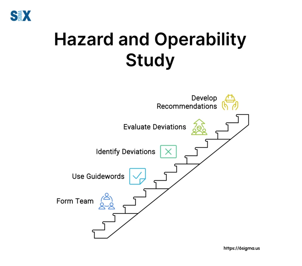 Hazard and Operability Studies (HAZOP) are systematic, multidisciplinary analyses of process units or operations that identify how deviations from design intent can create hazards. A HAZOP is typically conducted by a cross‐functional team (engineers, operators, safety specialists, etc.) who use guidewords (e.g. “more/less”, “no”, “reverse”) on each process node (equipment, line, or procedure) to uncover potential failures. For example, one infographic illustrates HAZOP as a stepwise process: form the team → apply guidewords at each node → identify deviations → evaluate their causes and consequences → develop recommendations.